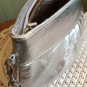 This pretty bag is the perfect accessory for a fancy night out! It's big enough to hold all the essentials, but small enough to carry in one hand. There are a few spots near the zipper where the silver rubbed off, but it's hardly noticeable! Size is 10x6.5