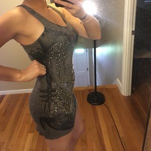This dress is super fun and cute! Form fitting and comfortable. Great for any rockstar!! Some animal print and rhinestone face embellishments on it to add flare!! Pit to pit measures 15in. Shoulder to bottom measures about 33in. Dress has so stretch to it, also.