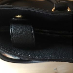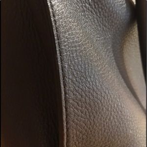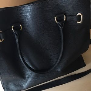 Only used TWICE!!! Great for work or everyday use. Fits a standard laptop. Shoulder strap fits neatly inside. 3 separated inside compartments, zippered compartment in the center, separating 2 large compartments. Gold accents, snap in the center, handles and shoulder strap.
