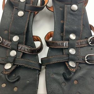 Wedge sandal in black leather and dark brown patent leather with contrast orange stitching. Size 9, good condition.