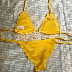 Yellow triangle String Bikini. Size chart is listed in pictures. The nice thing about this suit it it is adjustable at the hips, neck and back. The top is padded, the bottoms are Cheeky. I am willing to mixed sizes on tops and bottoms as long as the sizes you need are available. ❌trades