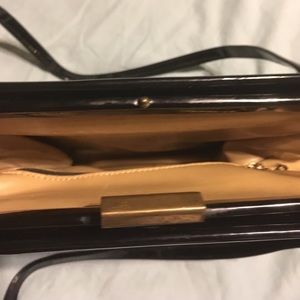 Cute black vintage patent leather purse. Small straps with tan leather interior. A few scratches on it but it's from the 50-60 era so besides that great condition.