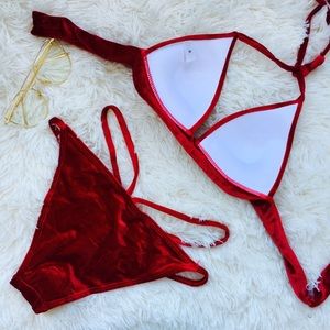 The "Scarlett" Velvet Halter Bikini 🌸 Bikini top is firm, formed and has push up padding. Bottoms are different than many other velvet bikinis with its second straps that can be worn high on the waist. Bikini is a true red. Sizes run slightly small, so it may be best to order up one size. ❤️ Sunglasses in product photos are also for sale 😉