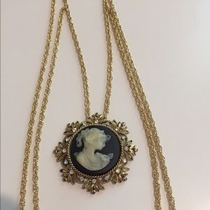 Stunning 3-Strand gold tone chain necklace with attached cameo pendant. Purchased in NYC at an art fair. Shortest chain measures 16-18 1/2" and is adjustable. Second chain is 32". Third is 44". Very nicely made piece in pristine condition. Truly unique!!