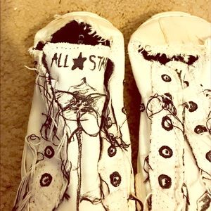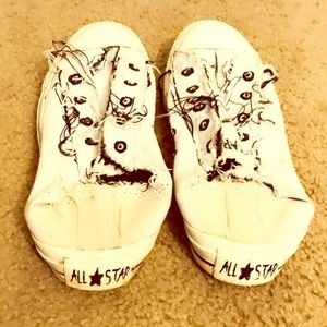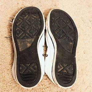 Converse shoes. Size 5. Sometimes When I worn them stepped on the back, so they were folded down but you can still wear them regularly. There at some stains from regular use, other than that they still have a lot of life in it. Thanks for checking!
