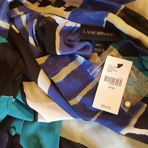 Lane Bryant sheer graphic print button down blouse with attached scarf that can be worn in many different ways. Preowned in excellent condition. Size listed as on tags (14/16). Please see pictures.