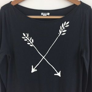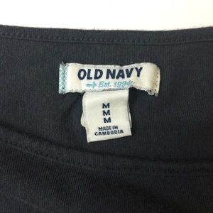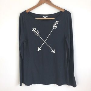 Long sleeve Old Navy tee with white/gray arrow graphic. Color is a very dark gray (listed as “carbon” on website). Boatneck. 60% cotton, 40% polyester. Soft and stretchy material. Not sheer. Size M. Approx. 18” bust, 27” long from shoulder to hem. Worn/washed once. No damage or wear.