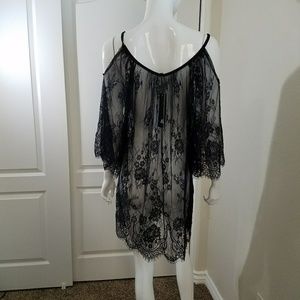 So cute! Cover up in floral lace. Cold shoulder. Can be worn with shorts & shirt or swimwear. Runs big. You can order your usual size or 1 size down. Mannequin is wearing a small.