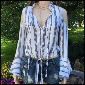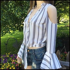 Ruffled Sleeve Blouse; polyester georgette material; features include convertible choker type collar (can be left untied; has a cute flare-sleeve and Cold shoulder; no stretch to material- suggest to size up as this runs small.