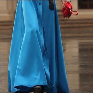 An elegant, yet casual maxi dress that comes in turquoise. It features a traditional pointed collar and buttons down the front with matching buttons. The sleeves are long, but are roomy enough to be rolled up, as shown. The bodice is a precise fit, with stitched princess seams that run on both sides. The waistline is defined by a black fabric belt that may be adjusted for comfort. The skirt is gently gathered at the waist, creating comfortable fullness. The hemline ends at the floor. NWT!