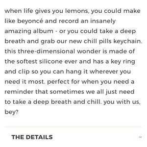 Ban.do bando Chill Pill Keychain NEW never used. Coolest 🔑 Keychain Ever. so VeryC👀l hanging out of your jeans pocket. ❤️or not. Lol💜or clipped to a your Purse, Tote, Backpack or Gym Bag. if youre not a Keychain person maybe hanging on the Dash in your car. ✅listing includes chill pill keychain only. Any other items in pics sadly arent mine nor included w purchase ✅Love Potion keychain-Another super cute accessory-see sep listing for that💢Collect them all. I had to. Lol.-debbi💖👀⭐️