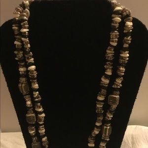 You are viewing a chunky double stranded necklace that is about 13 1/2". It is preloved likely a bit vintage. Colors include beiges, browns & black. The beads are a good size on the thicker side not tiny beads. Different shapes. Would look great on with a white blouse and jeans or dressy. Buy before they are gone.