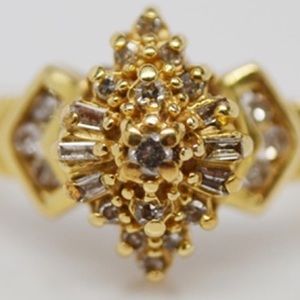 Stunning estate 14k yellow gold 0.25 ctw diamond ring. Hallmarks: 14k, A ©. Total weight: 2.50 dwt. Beautiful and unique tiered basket setting design with both baguette and round single cut diamonds. EUC. Pre-loved. Size: 6.5