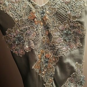 Blue/green 70% silk 30%polyester gown with beads and sequin, lace bottom. Floor length. Thin straps, cross back