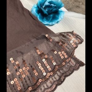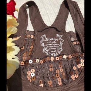 Licorice tank top, pretty gold/copper sequins. size Small. light brown/taupe color with beautiful bronze / copper sequins at top (above bust) and all along the bottom. Ribbed tank. Stretch fabric. Stretchy. 100% Cotton. Cotton tank. Approximate measurements in photos. Size Small. Wrinkled. Flowers not included. Sparkly! so pretty and comfy. Gold sparkles. Sparkly shirt. Sparkly tank. Brown and bronze. Glitter look. Embellished top. Embellished tank top. Embellished shirt. Brown tank.tank top.