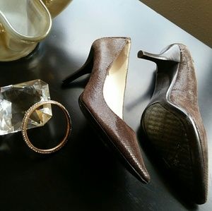 ๐Host pick!! Weekend Wanderlust party 7/1/17!!๐ Calvin Klein faux snakeskin Dolly pumps! These classic heels are a must have for any wardrobe. Faux brown snakeskin exterior, light tan interior. Pre-loved but still in beautiful condition! 2 light wear marks on the back of the left heel, but not very noticeable (pic #6). Size 7. Open to offers!!