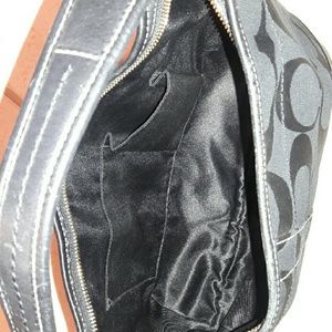 Timeless Coach ERGO hobo bag measures 12" x 8". Features an external pouch with brass snap closure and 3 internal compartments. Black jacquard signature print, with black leather accents, brass hardware and white stitching. The matching wallet measures 7.5" x 3.5". The left side features 4 card slots and 1 slip pocket, the right has 6 card slots, 2 slip pockets and a zipped pouch for coins. Snap closure and a back slip pocket.