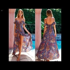 Precious hi-lo dress. Off the shoulder with straps. Chiffon. Beautiful floral print. The material is sheer! Sexy slit in the front. Waist has elastic. . medium- waist. 24" w/o stretch. Bust 33" length in back is 48". Large waist 25" w/o stretch Bust 36" length in back is 48". XL waist 26" Bust 36" length 48". This can we worn as a beach cover up. CONSIDER sizing up