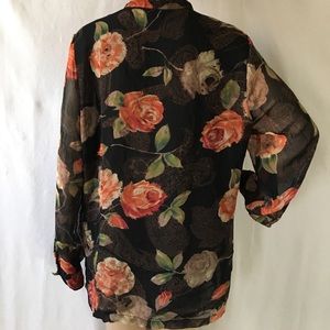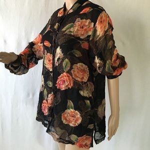 Stunning blouse by Claudia Richard! Lined polyester body, with single layer, sheer sleeves. Satin trim throughout, Mandarin collar, six button closure and buttoned cuffs. One cuff had a tear, but I've sewn it and its unnoticeable. Black and gold with beige, pink, green, red and coral flowers, the top goes with everything! You will absolutely love it!Tag for size was removed but it's a size 10-12. 28 inches long from top of shoulder and 18 inches wide, from armpit to armpit. Final sale.Thanks! ๐