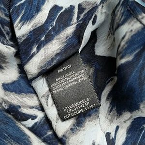 NWT Gorgeous Princess Neckline Halston Heritage Navy Print Asymmetrical Dress. Front has front lined pleated bodice. Pleating continues through the elastic waistline with matching selt tie to the bottom of the skirt. Left side of the hip has a flap placket.Skirt is fully lined. Left side of the skirt is 5" shorter than the right with a even higher slit. Pit to pit 19" no stretch. Elastic waistband 15.5" unstretched. Length from back 43". Stock photos property of Nordstrom. O2