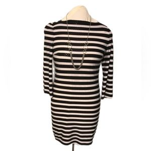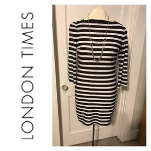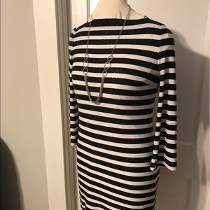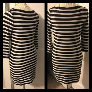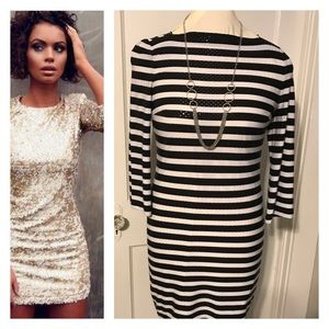 What a great look for a fun night out. Red accessories and heals and you will get noticed. 95% polyester and 5% spandex. Can be washed inside out on delicate and hung dry. 3/4 sleeve , boat neck shift dress is in perfect condition.