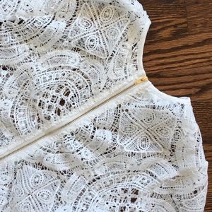 The "Paula" crop top. White crochet/lace-like material with elegant gold zipper. Fits true to size. Wear over a swim top, bralette, or bandeau. ๐