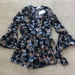 Bell Sleeve Butterfly Print Romper. Love this romper Long sleeves. Smock waist with tie at the side. V neck. Lined. Measurements laying flat: S: 30.5" long, 18" pit to pit. M: 31" long, 19" pit to pit. L: 31" long, 20" pit to pit. I am modeling size Small. 100% rayon. Boutique item, NWT. #BA13