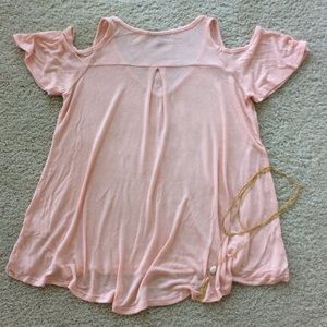Gorgeous Peach Cold Shoulder Top. Versatile summer staple💕 Can be dressed up with skinnies or crop pants and heels or down with cutoffs an sandals. V neck. Hi lo hemline.