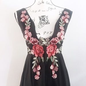 A Floral Appliqué Evening Mini A-Line Dress in Black. Features v-neck and a high waist. Part of the Appliqué below Bust is not stitched into dress. A perfect addition to any closet for the summer party! .