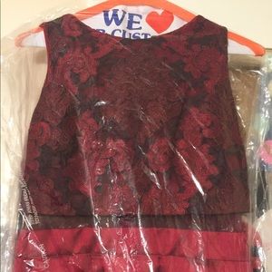 Gorgeous dress. Lacey top connected to the bottom by mesh material. Depending on body type, mesh might not show. Tiniest hole on back, can't notice it. Small stain, shown in pic, again can't notice. Freshly dry cleaned. Approximately* 58 in from top shoulder to bottom. Super flowy. Only worn once to a wedding & I've never been so comfortable in a dress before! Oh & there's pockets! I'm 5' 1" and took a few inches from bottom and tightened straps. Wore super high heels before being measured.