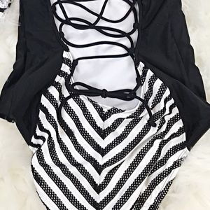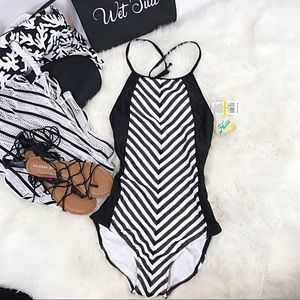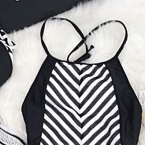 ❤️ONLY 1 Medium left‼️ NEW BOUTIQUE 1 piece bathing suit, black & white, high halter, slimming zigzag pattern, fully lined mesh, sexy tie up back. Pair with a cute cover up & sandals.
