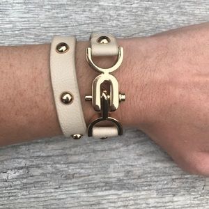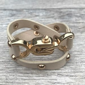 Faux ivory synthetic leather with gold metal wrap bracelet. Toggle closure with release buttons. Length 13". No offers firm price - listed at clearance