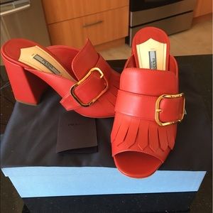 Never worn!! These heels are perfect for summer and extremely comfy. My biggest problem with mules is my foot slipping out but with these my foot is stable! Comes with box and dust bag !