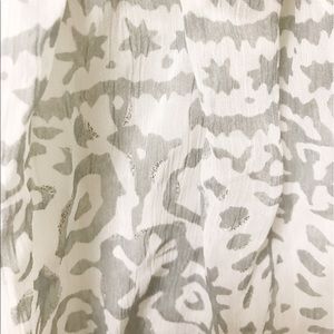 Gray and white, silver sparkle accents throughout / lined / zipper and hook clasp in back / waist tie in back / polyester / approx 24.5" long / approx 13.5 across empire waist