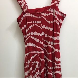 Darling red and cream polka dot dress. Has a cream lace bow. Size large that fits more like a juniors large. Uneven flowy bottom. Has a red slip that almost goes all the way down. Worn twice. Smoke and pet free home.