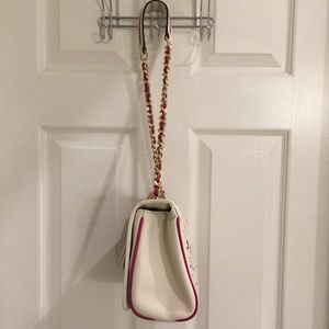 Chain and leather strap. Tassel. Linen interior. Brand new. Dust bag and card. Hot pink, yellow, turquoise and blue. Bag background is cream colored. Gold chain and logo closure. Height 6.25", Length 9.5", Width 4". Chain 15" drop for shoulder bag or adjusts to 8.5" drop for handbag. **Will sell for less on e b a y**