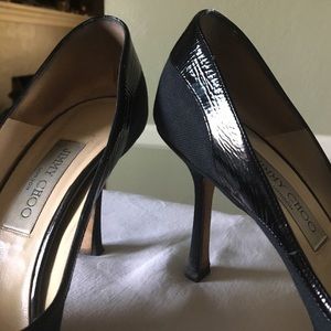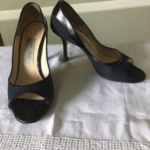 Black canvas peep toe pumps with patent leather trim at uppers. Timeless and gorgeous. Some normal signs of wear but in really good condition. Still a lot of life left in these shoes! Comes in original box with original duster bag 💄👠