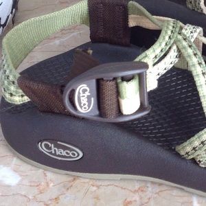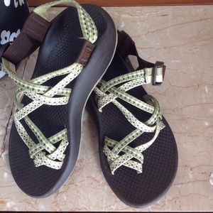 Chacos sandals. Size 5w. Green/cream color.Toe strap. Vibram sole. Good preowned condition. Please look at all pictures before you purchase. And ask any questions. Thanks