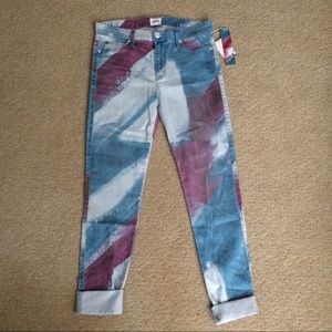 Awesome Hudson jeans! Mid rise skinny jeans. Stylish and comfortable! Fit quite small for a 28 (which I am, but these fit me very tight throughout). Waist 30", inseam 30". 65% tencel, 23% cotton, 8% polyester, 4% elastase. Soft, and thinner than most jeans. Lighting from my photos make color look more intense, but they're actually soft tones like in stock/model photos.