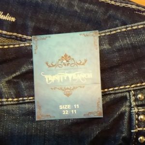 Trinity ranch stretchy hip hugger denim jeans. Size 11. 32 x 35. Junior size. Trinity ranch emblem imprinted on back left pocket. Rhinestone on front pocket. Silver embellishments down the outer side of each leg to the knee. Embroidered floral design with grays and light blues on front leg and back pocket, with rhinestones and silver embellishments. 98% cotton. 2% polyester. 9" flare at bottom of leg. New