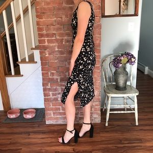 MAKE ME AN OFFER. Vintage not branded. 90s look. Looks just like a reformation dress. Dress it up or down. Black with little white/ yellow flowers. Ties in back. Lightweight material. Slits on either sides of legs. Ties in back. Reformation only for views.