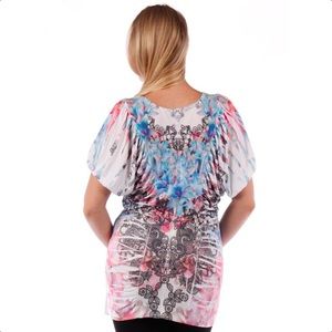 THIS TOP RUNS SMALL, PLEASE CHECK THE MEASUREMENTS BEFORE YOU BUY. White, turquoise, pink, and black in color in a streaky Sublimation floral & scroll design. Scoop neck, short  banded dolman sleeves, ruched in front & back, straight hem, fabric is 96% polyester, 4% spandex, hand washable. NWOT