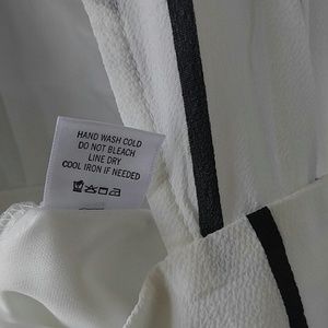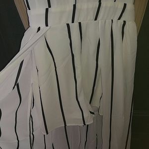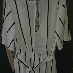 This jumpsuit is white/black. Has a plunging neckline 3/4 sleeve romper, with attached skirt.