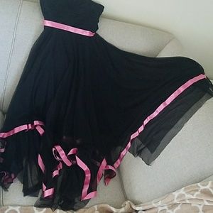 Beautiful dress from Cache in a size 2. This dress was worn once to a homecoming dance and has been hanging in the closet ever since. The strapless top has boning in it for extra support and the bottom is layered with black sheer fabric and pink satin ribbon. The dress comes with a ribbon belt that came with the dress and matches perfectly.