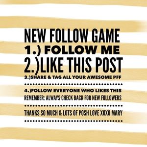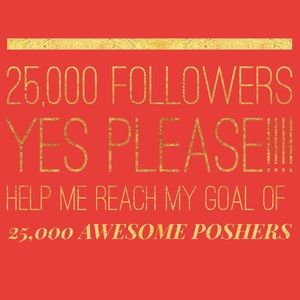 Please help me reach my new GOAL of 25,000K POSH Followers!!!! While growing your own closet followers😀 The Game is 1.) Follow Me 2.)Like this Post 3.)Share & Tag all your Awesome PFF 4.)Follow everyone who likes this Remember: Always check back for new followers THANKS SO MUCH & LOTS OF POSH LOVE XOXO MARY