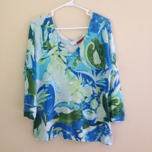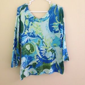 Awesome Tropical colors , 3-4 length sleeve , double V neck, looks great with white slacks or skirt. Like new with no flaws or stains