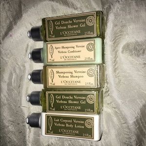 L'Occitane Verbena 5 Piece Set includes: 1 Body Lotion, 1 Shampoo, 1 Conditioner, 2 Shower Gels. All 2.5 oz.