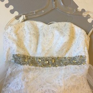 Wedding gown for sale. Worn once but hasn't been dried clean. The bottom of the dress has stain due to wear. The dress is slightly adjustable but best fit size 0. Offers welcome.
