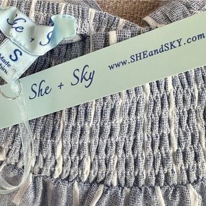 Feminine off the shoulder statement top featuring gorgeous structured puffed layered sleeves, smocking, and subtle stripes. This top is reversible and bow can be worn in the front or the back. Truest blue is model photos taken outdoors.