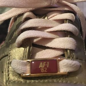Size 6.5 (US) special edition gold and pink Air Force Ones XXV '82. Shoes have rarely been worn and show little wear. Inside is pink satin like material. Pink laces with AF-1 badge emblem. Bottoms show very little wear. No major defects on shoe.